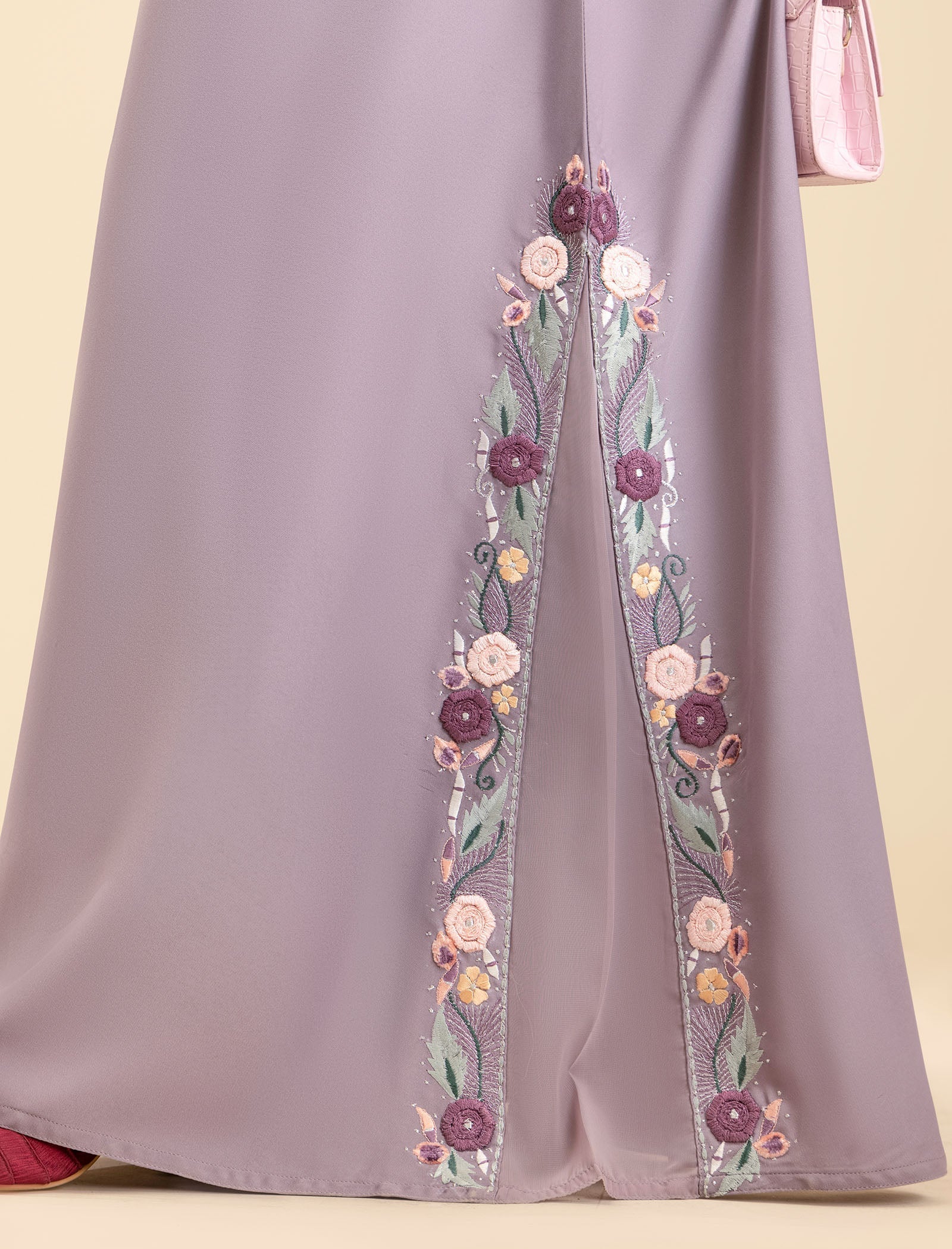 The Amethyst Glow abaya is a perfect blend of modern style and traditional elegance. The embroidery features a mix of threads and colors, designed to match the latest trends. The Kali design on the sleeves and daman (hem) adds intricate beauty and sophistication, enhancing the overall look of the abaya.
